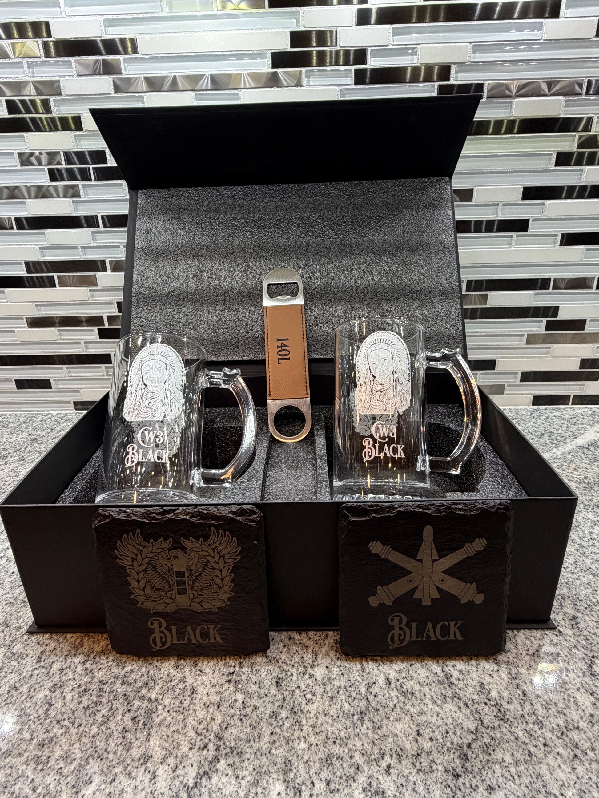 • Engravable Bottle Opener – Add names, logos, or insignias to complete the set