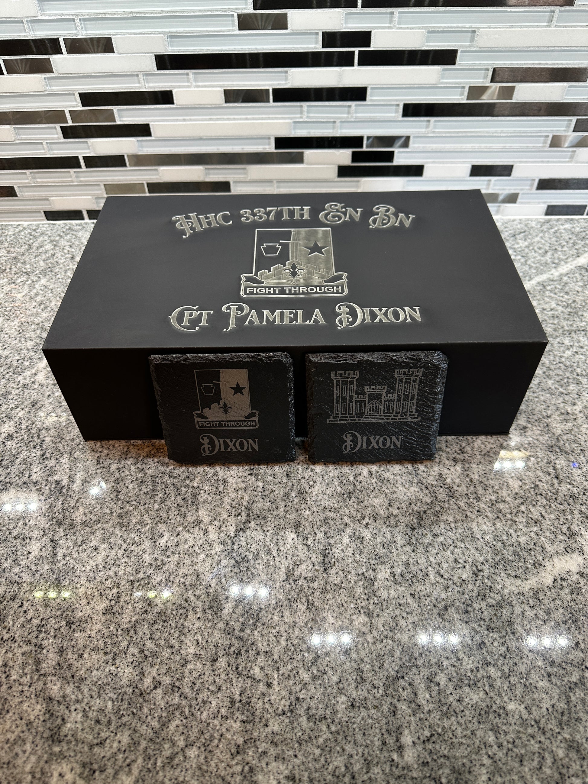 • Engraved Slate Coasters – Stylish, durable, and a great complement to your mug set