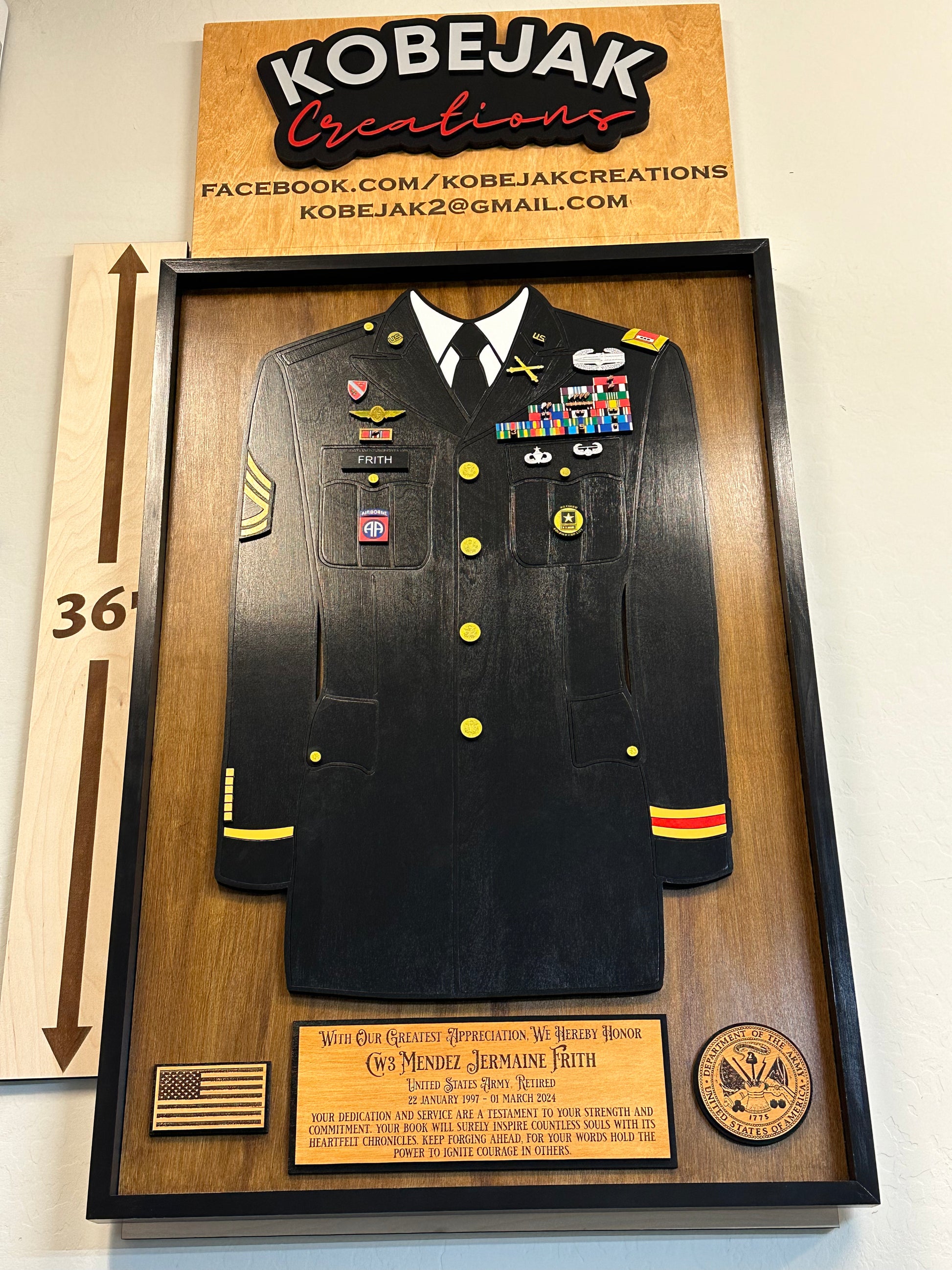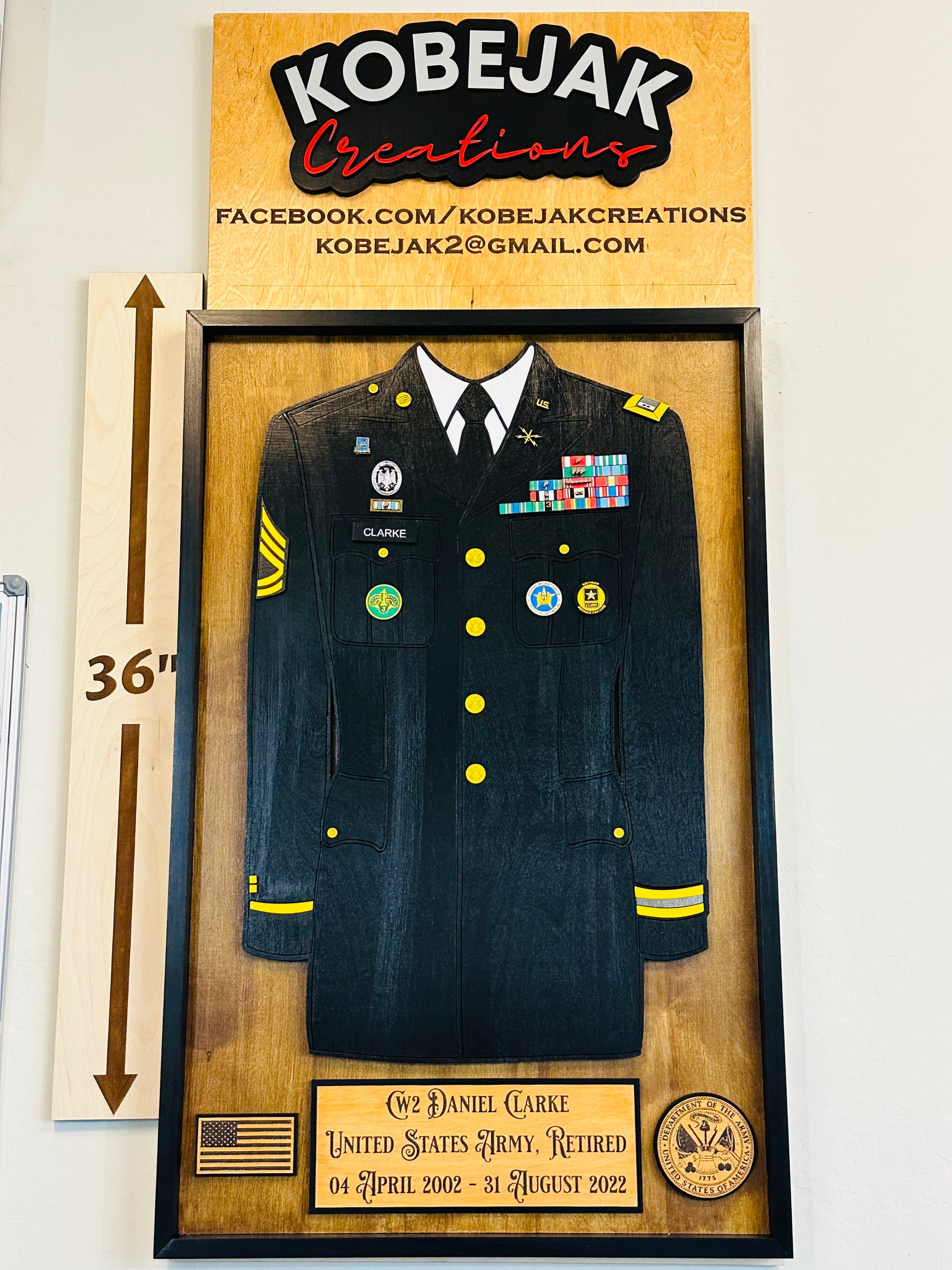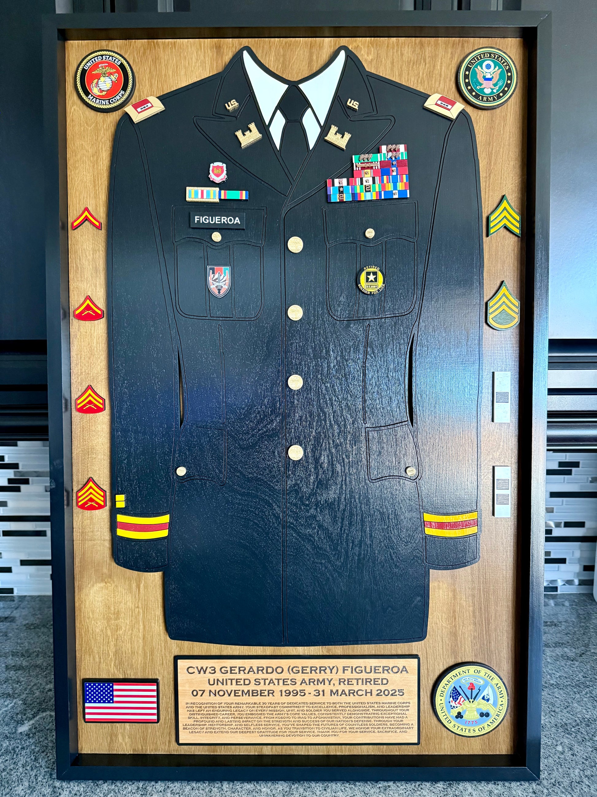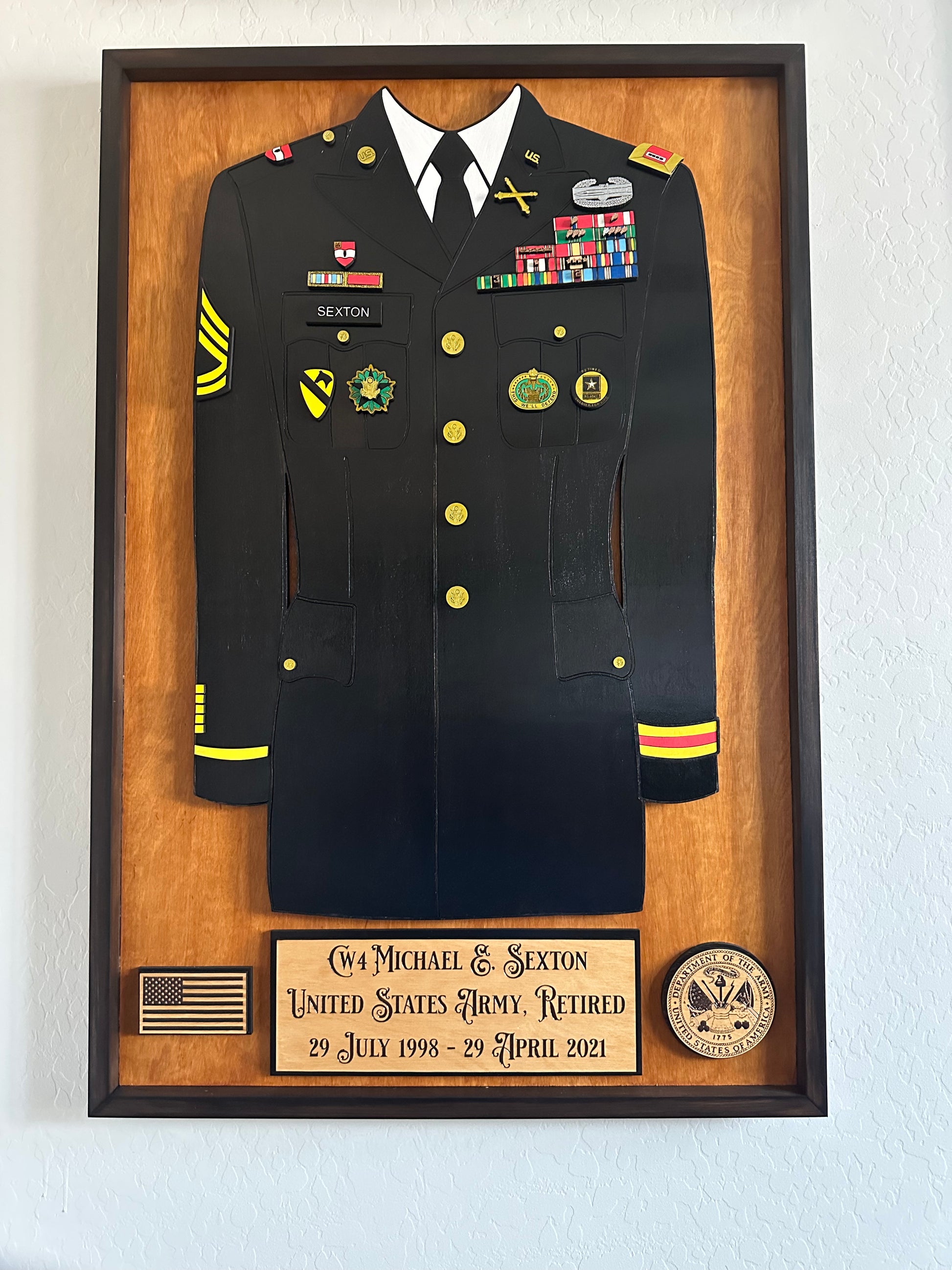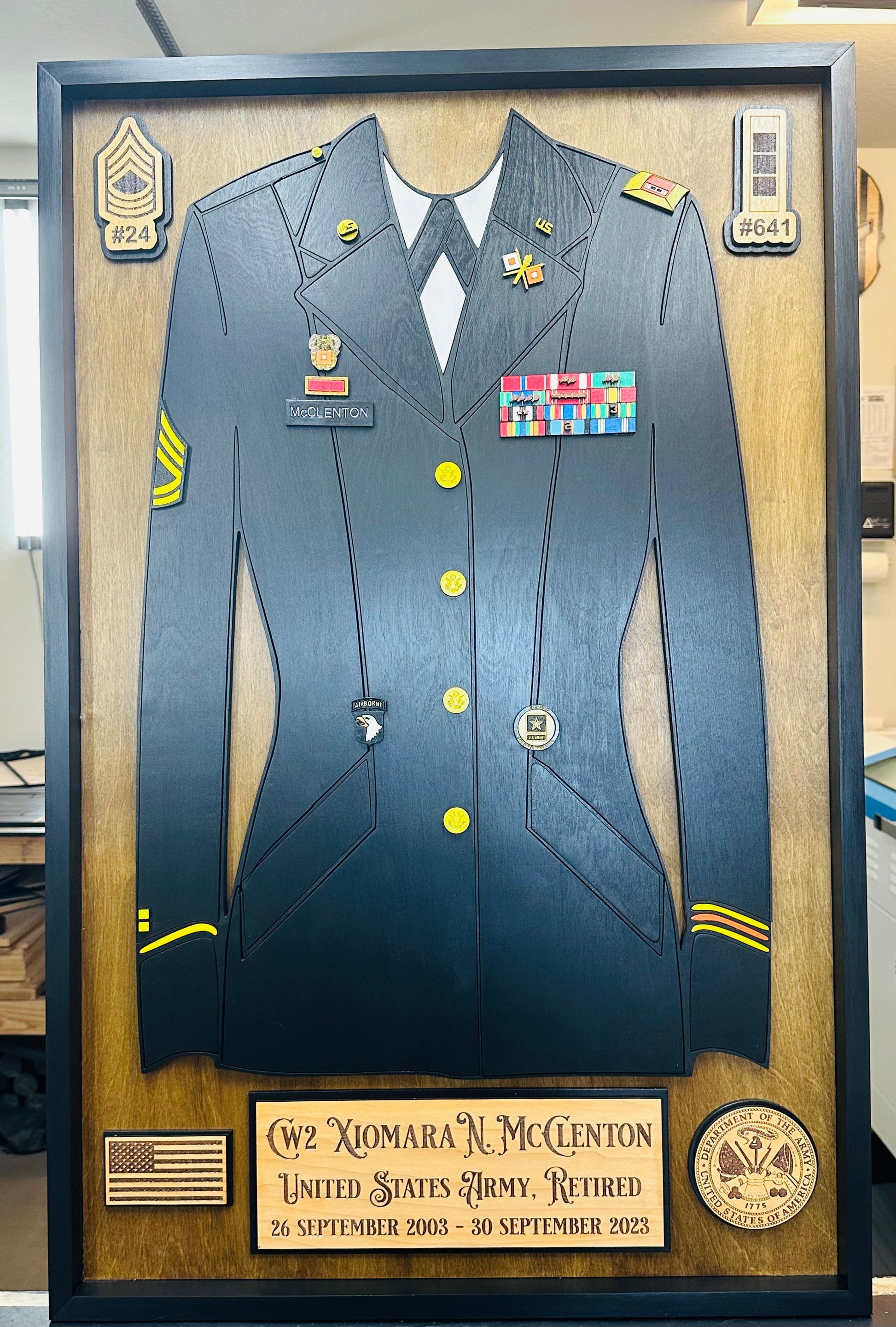 Honor a distinguished military career with our exceptional retirement plaque, meticulously designed to replicate the retiree’s uniform. This one-of-a-kind tribute captures every detail, ensuring a meaningful and accurate representation of their service.