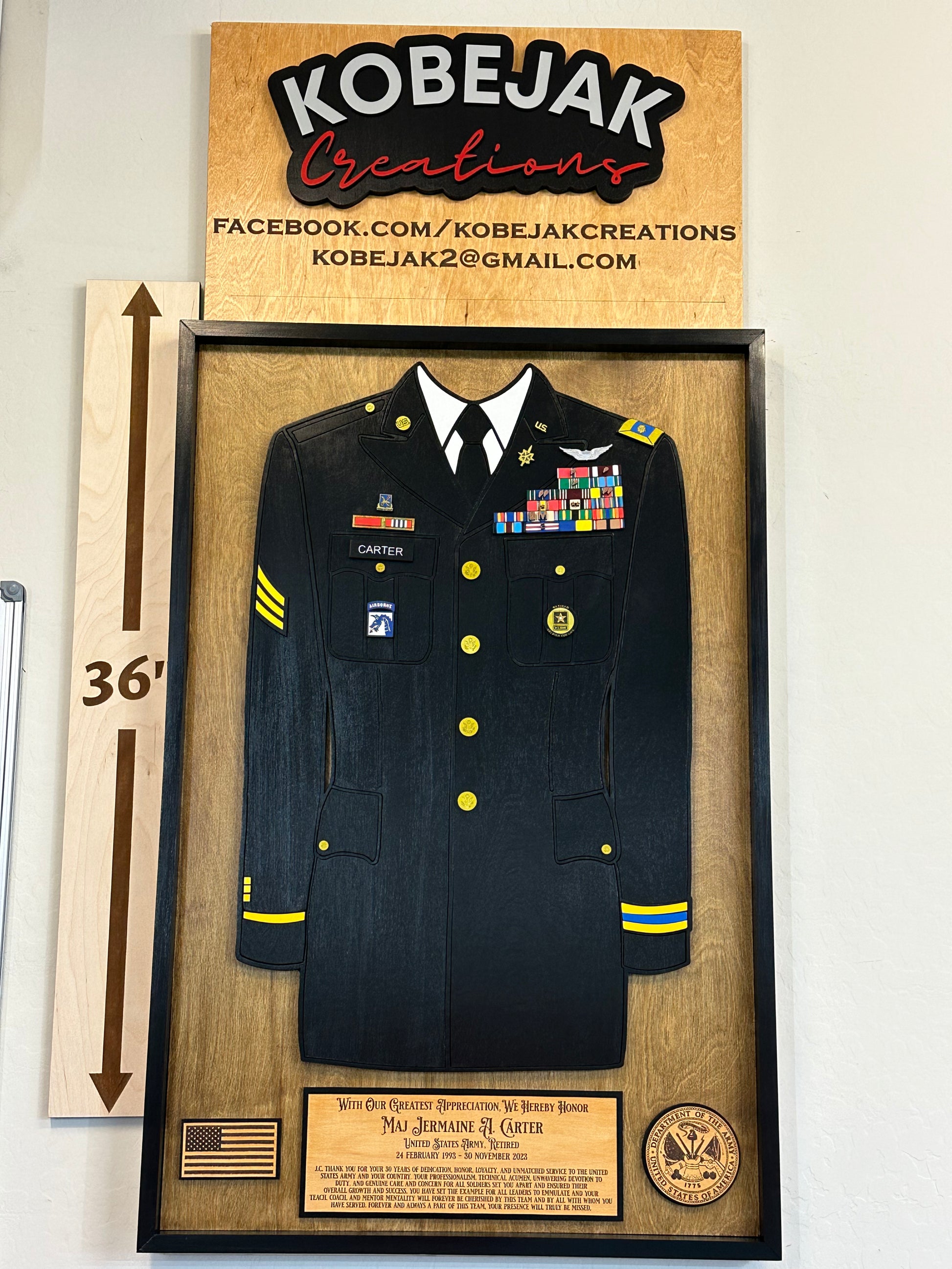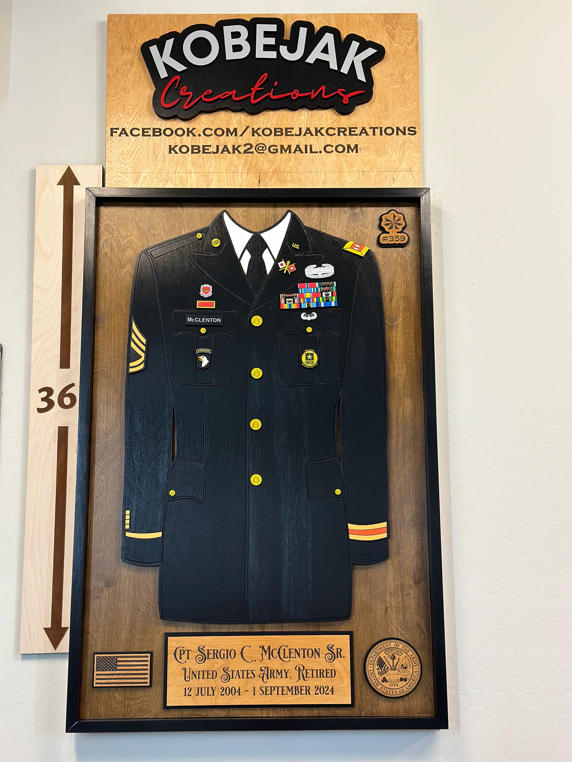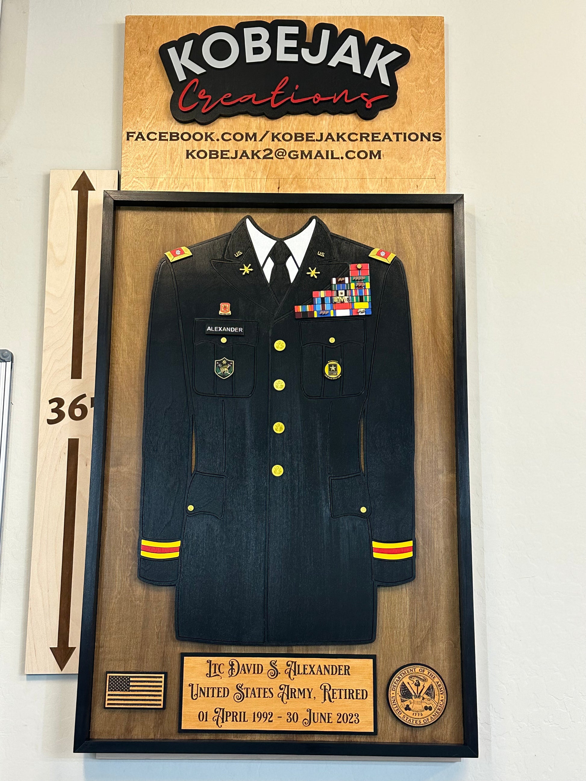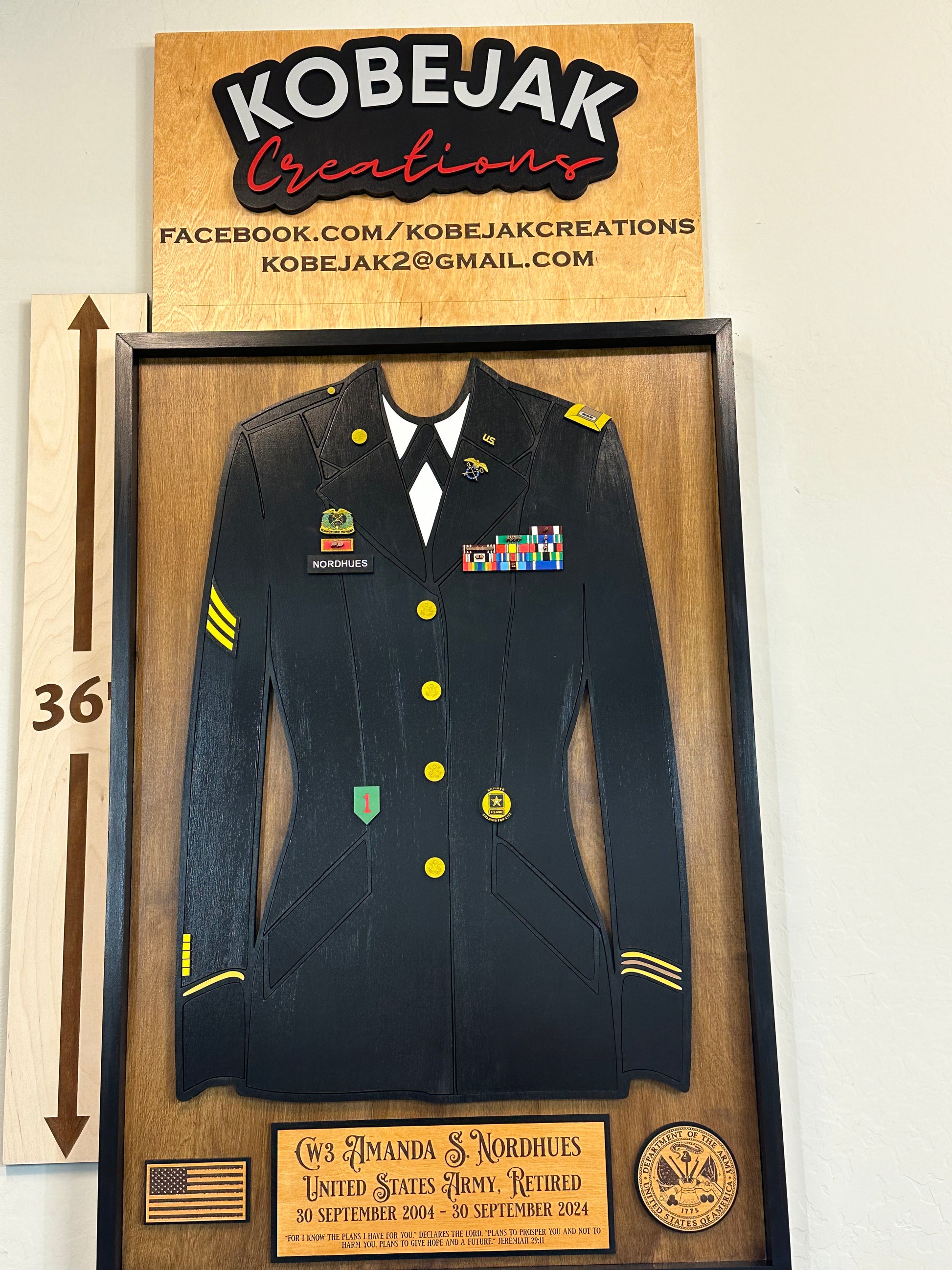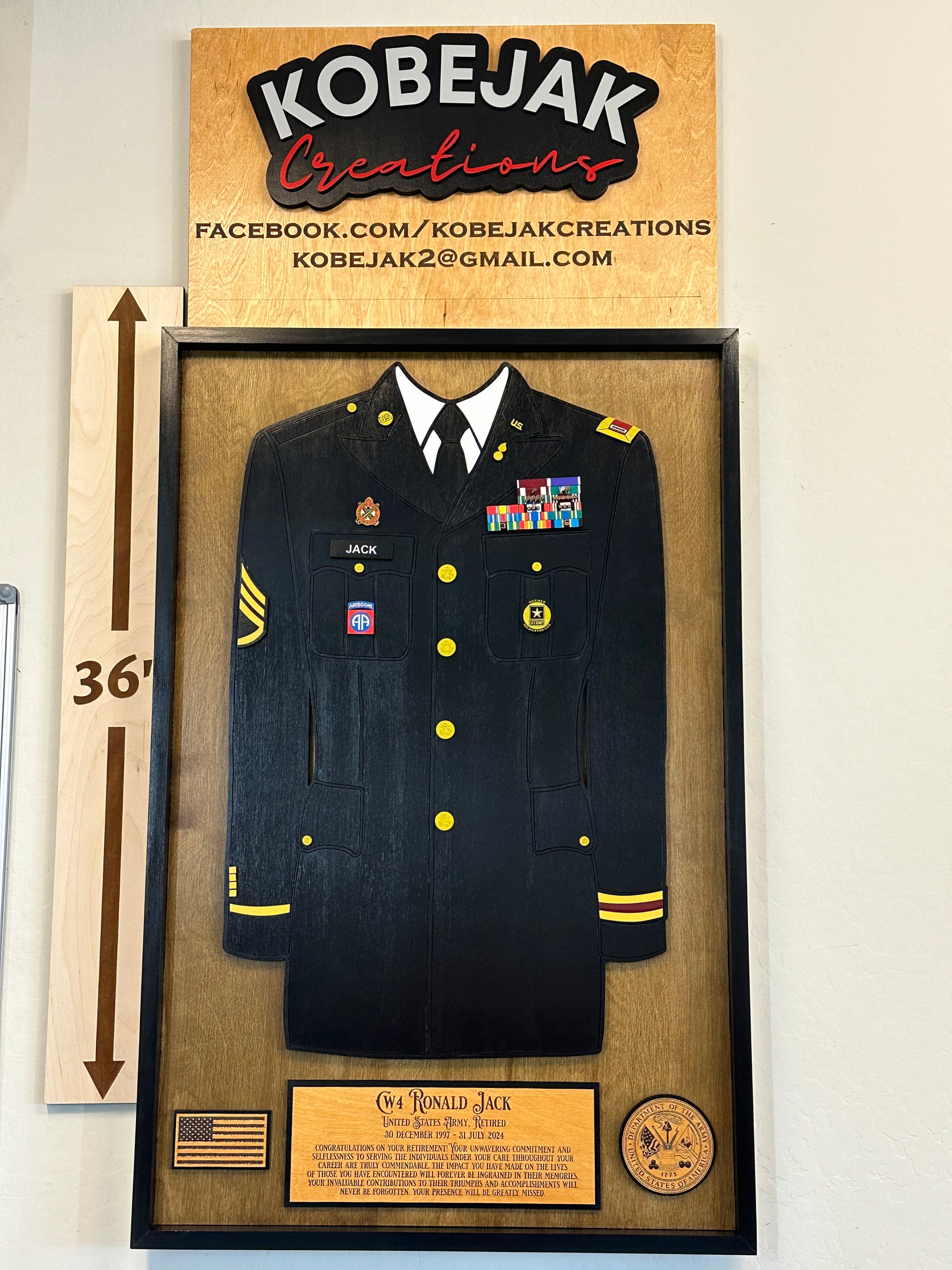 Honor a distinguished military career with our exceptional retirement plaque, meticulously designed to replicate the retiree’s uniform. This one-of-a-kind tribute captures every detail, ensuring a meaningful and accurate representation of their service.