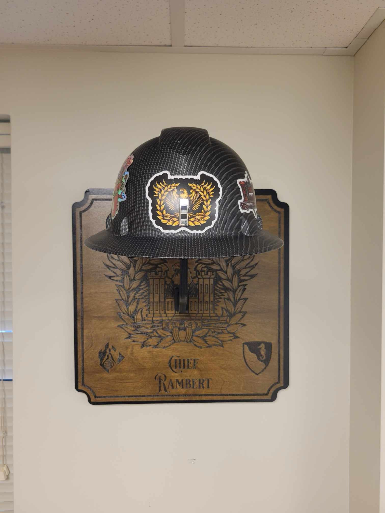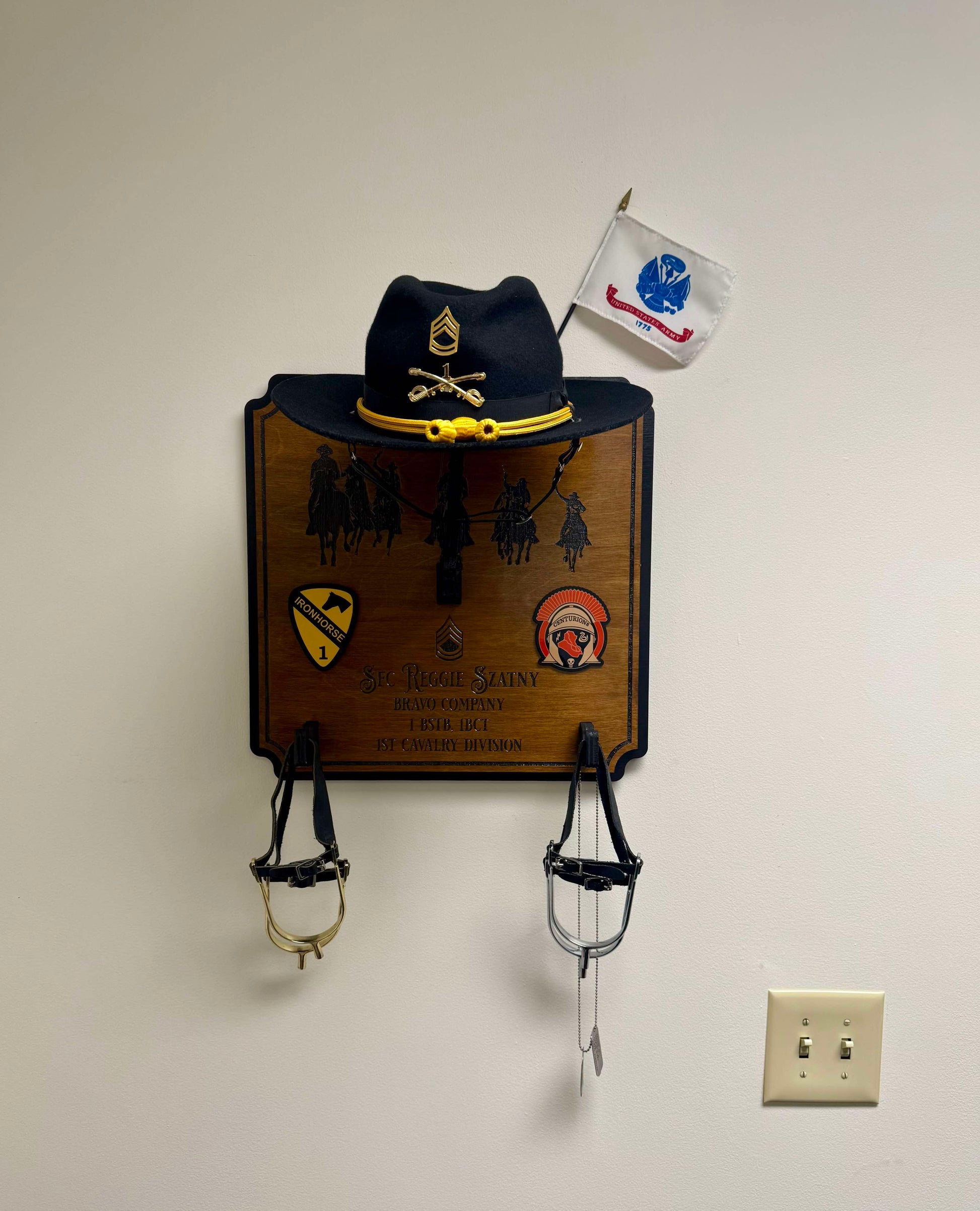 Showcase your Stetson and spurs with our expertly crafted 17" x 17" Stetson & Spurs Holder, designed to honor tradition and service while adding a touch of sophistication to any office or home.