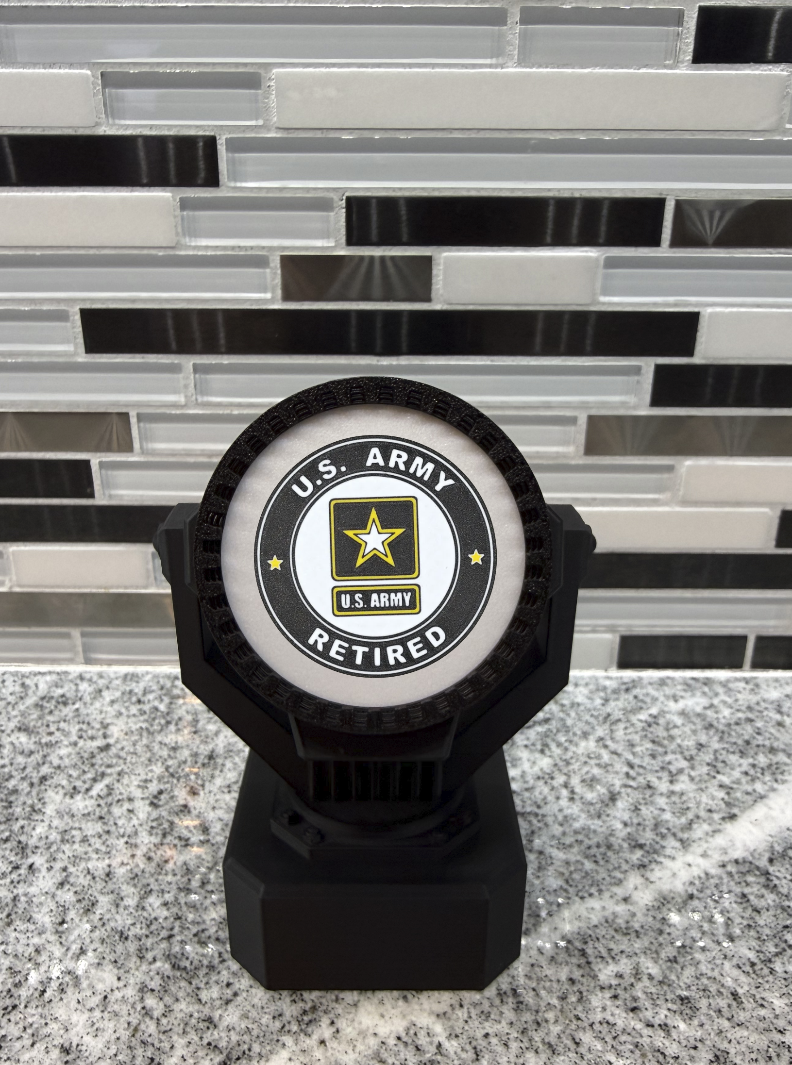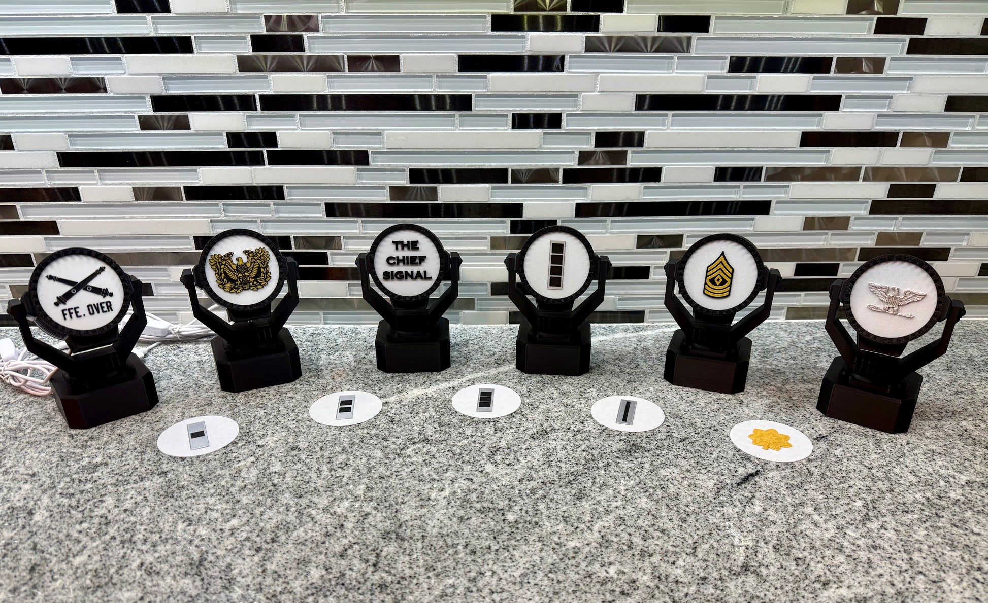 The prototypes shown represent just a few possibilities, from branch emblems to humorous sayings and mission-inspired themes. Because every disk is custom-made, the final product can be tailored to fit nearly any style, role, or occasion.